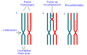Mediante el sobrecruzamiento entre los cromosomas homólogos que se produce durante la profase I de la meiosis, tiene lugar la recombinación genética o intercambio de fragmentos entre cromátidas de las parejas de cromosomas homólogos.