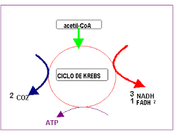 - Ciclo de Krebs: Por cada molécula de acetil-CoA que se oxida totalmente a CO2, se obtienen una molécula de CoA, tres moléculas de NADH +H+, otra de FADH2 y una molécula de ATP.
